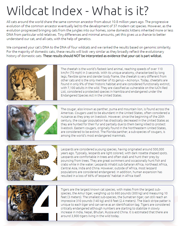 We waited about six weeks for results, and it was worth it. Her breed report totaled 33 pages. One of the fun parts of the report is the “Wild Cat Index,” in which four wildcats are used for genomic similarity. Think of the human DNA test that says you’re 1% Neanderthal. This wildcat test doesn’t mean your cat is part cheetah, cougar, lion or tiger.