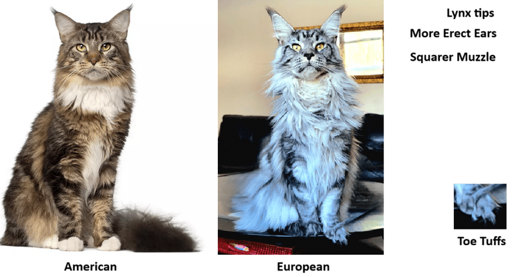 European Maine Coons are breed to have a wild feral look while American Maine Coons are breed to the original standard, i.e., how they looked decades ago in this country. Also, European breed are generally taller with more erect ears placed closer together.